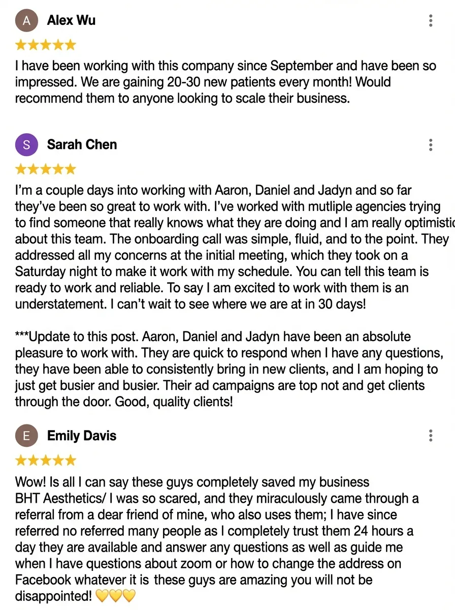 Predictable stream of qualified leads generated from market informed ads that you own, not an agency. No price shoppers or chasing just a reliable flow of patients ready to book consultations.